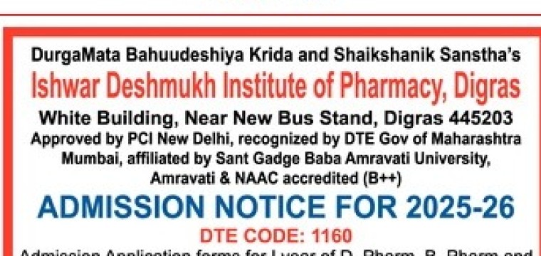 DurgaMata Bahuuddeshiya Krida and Shaikshanik Sanstha’s Ishwar Deshmukh Institute of Pharmacy, Digras White Building, Near New Bus Stand, Digras 445203 Approved by PCI New Delhi, recognized by DTE Govt of Maharashtra Mumbai, affiliated by Sant Gadge Baba Amravati University, Amravati & NAAC accredited (B++) ADMISSION NOTICE FOR 2025-26 DTE CODE: 1160 Admission Application forms for 1 year of D. Pharm, B. Pharm and M. Pharm (Pharmacognosy and Regulatory Affairs) are invited from eligible candidates for Institute level seats and seats remain vacant after CAP rounds (if any) Eligibility: As per the norms of Govt of Maharashtra State common entrance test (CET) cell, Mumbai and DTE Maharashtra State. Schedule of Admission: No Activity Schedule 1 Application form available From 20/10/2025 2 Last Date of Acceptance of form 07/11/2025 up to (05.00 pm) 3 Display of provisional merit list for all courses 08/11/2025 up to (03.30 pm) 4 Submission of grievances (if any) 10/11/2025 up to (03.30 pm) 5 Display of final merit list 11/11/2025 up to (03.30 pm) 6 Admission round for all category of students 12/11/2025 to 17/11/2025 7 Contact for query 7795767999 / 7588778971 / 9021868661 / 9916030429 Note: Those who applied and whose names appeared in merit list should attend counselling round personally with all original documents and required fees. The schedule and vacant seats are also displayed in the college website – www.ishwarpharmacyinstitute.com Principal Mob.: 7795767999, 9916030429