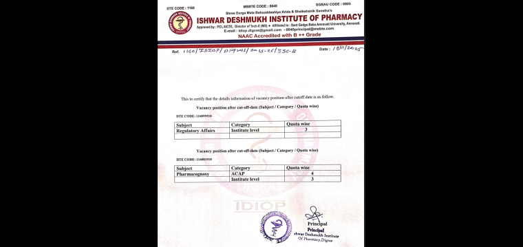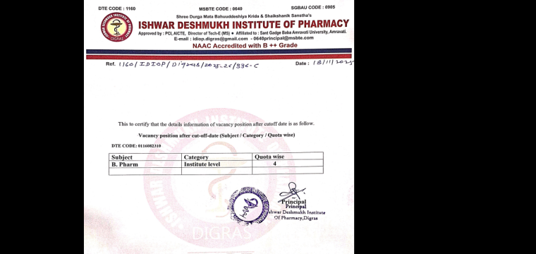 DurgaMata Bahuuddeshiya Krida and Shaikshanik Sanstha’s Ishwar Deshmukh Institute of Pharmacy, Digras White Building, Near New Bus Stand, Digras 445203 Approved by PCI New Delhi, recognized by DTE Govt of Maharashtra Mumbai, affiliated by Sant Gadge Baba Amravati University, Amravati & NAAC accredited (B++) ADMISSION NOTICE FOR 2025-26 DTE CODE: 1160 Admission Application forms for 1 year of D. Pharm, B. Pharm and M. Pharm (Pharmacognosy and Regulatory Affairs) are invited from eligible candidates for Institute level seats and seats remain vacant after CAP rounds (if any) Eligibility: As per the norms of Govt of Maharashtra State common entrance test (CET) cell, Mumbai and DTE Maharashtra State. Schedule of Admission: No Activity Schedule 1 Application form available From 20/10/2025 2 Last Date of Acceptance of form 07/11/2025 up to (05.00 pm) 3 Display of provisional merit list for all courses 08/11/2025 up to (03.30 pm) 4 Submission of grievances (if any) 10/11/2025 up to (03.30 pm) 5 Display of final merit list 11/11/2025 up to (03.30 pm) 6 Admission round for all category of students 12/11/2025 to 17/11/2025 7 Contact for query 7795767999 / 7588778971 / 9021868661 / 9916030429 Note: Those who applied and whose names appeared in merit list should attend counselling round personally with all original documents and required fees. The schedule and vacant seats are also displayed in the college website – www.ishwarpharmacyinstitute.com Principal Mob.: 7795767999, 9916030429